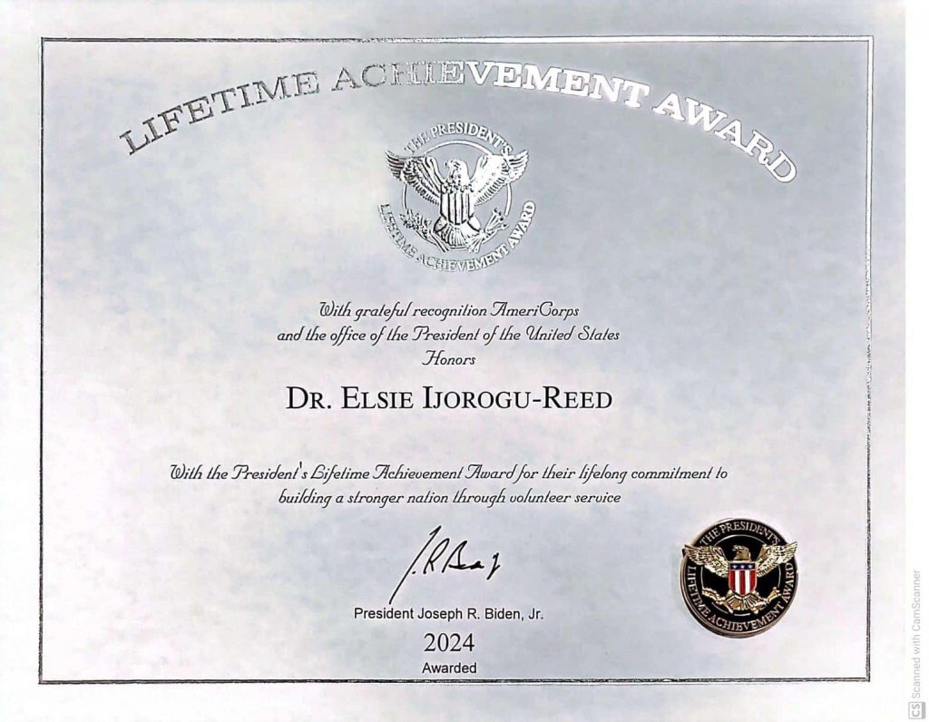 A Mental Health Practitioner, Dr Elsie Ijorogu- Reed has received the prestigious President’s Lifetime Achievement Award from Former United States President, Joseph R. Biden, Jr.